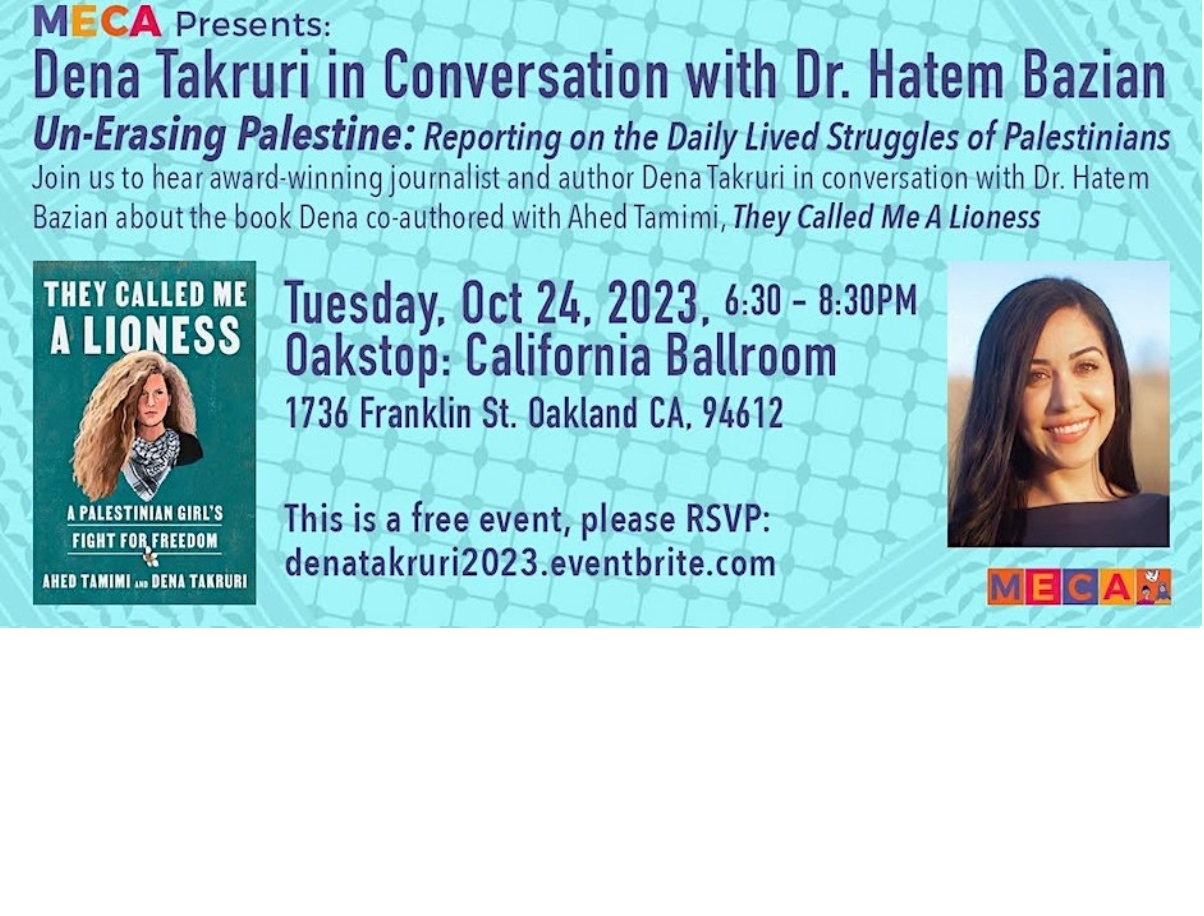 Please join us to hear award-winning journalist and author Dena Takruri in conversation with Dr. Hatem Bazian about Dena’s reporting on the daily struggles of Palestinians. Dena will also talk about the book she co-authored with Ahed Tamimi, They Called Me A Lioness, as well as her AJ+ Documentary “One Day in Hebron”.