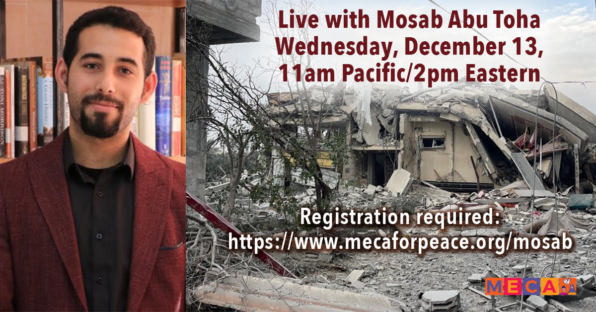 Join MECA for this special online event with poet Mosab Abu Toha. The event will honor two dear friends and colleagues Refaat Al-Areef & Doaa Al-Masri who were killed by Israeli attacks several days ago and feature poetry by Refaat as well as Mosab’s own work.