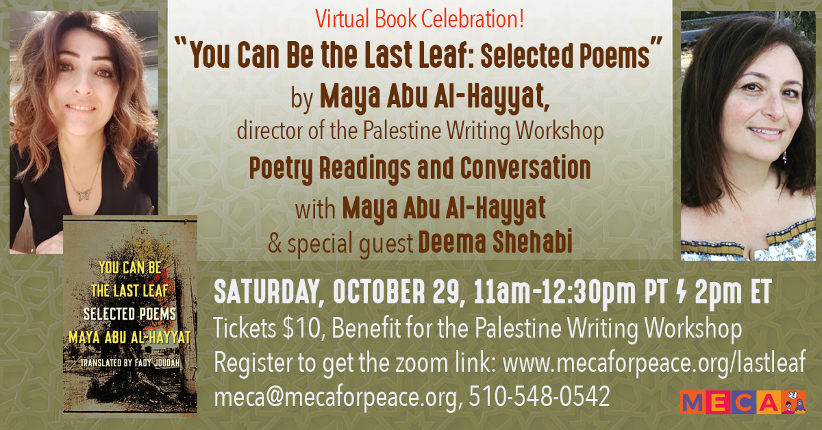 “You Can Be the Last Leaf: Selected Poems” by Maya Abu Al-Hayyat directs the Palestine Writing Workshop. She’ll read poems & be in conversation with poet Deema Shehabi