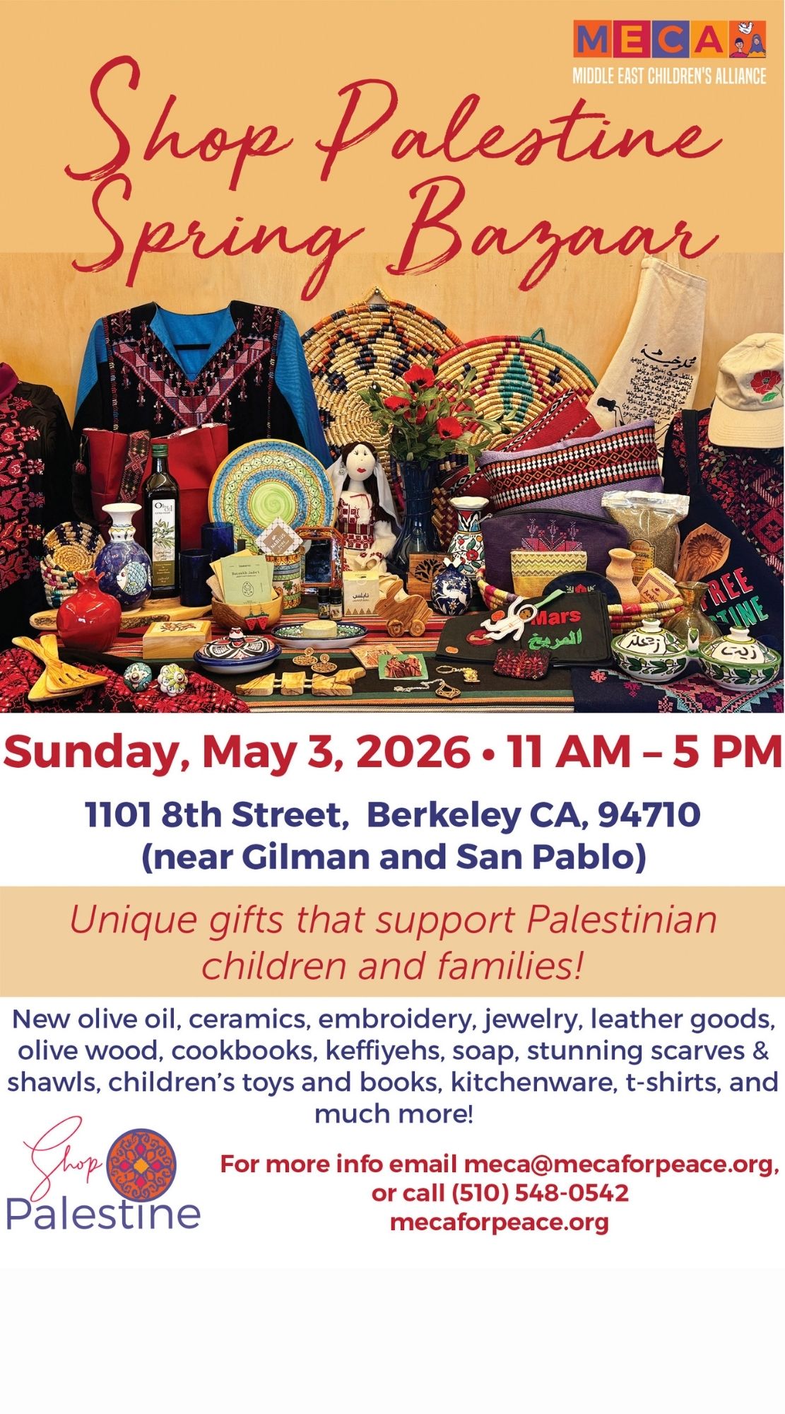 Shop Palestine Spring Bazaar Date: Sunday, May 3 2026 Time: 11 am - 5 pm Location: MECA Offices, 1101 8th Street, Berkeley CA 94710 We're excited to announce our second Shop Palestine Spring Bazaar happening Sunday, May 3rd from 11am - 5pm at our offices on 1101 8th Street in Berkeley. We will have our new [...]