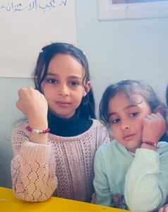 Ghada, the project’s Visual Art Facilitator, recalled Tulip with a smile struggling not to cry; “Tulip loved to draw flowers and houses. Her favorite color was purple. Always polite, calm, and beautifully dressed. She was a breeze.” She paused before continuing, “In this photo, she made a bracelet with her friends here in my corner. Tulip was loved by everyone. I worry now for her sister, Mira; they were always together in the project.”