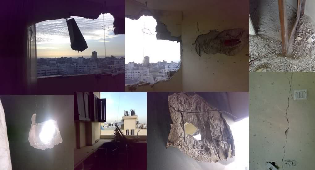 We kinda forgot about our apartment in Tal Alhawa in Gaza. It’s in the doctors’ building behind Al-Quds hospital and the Red Crescent. When it was all over, my dad took us in the car to see what happened in Tal Alhawa and to check on the apartment. We expected to find the windows broken, and maybe holes in the walls caused by arbitrary bullets. What we saw, though, was just …. Well, this…
