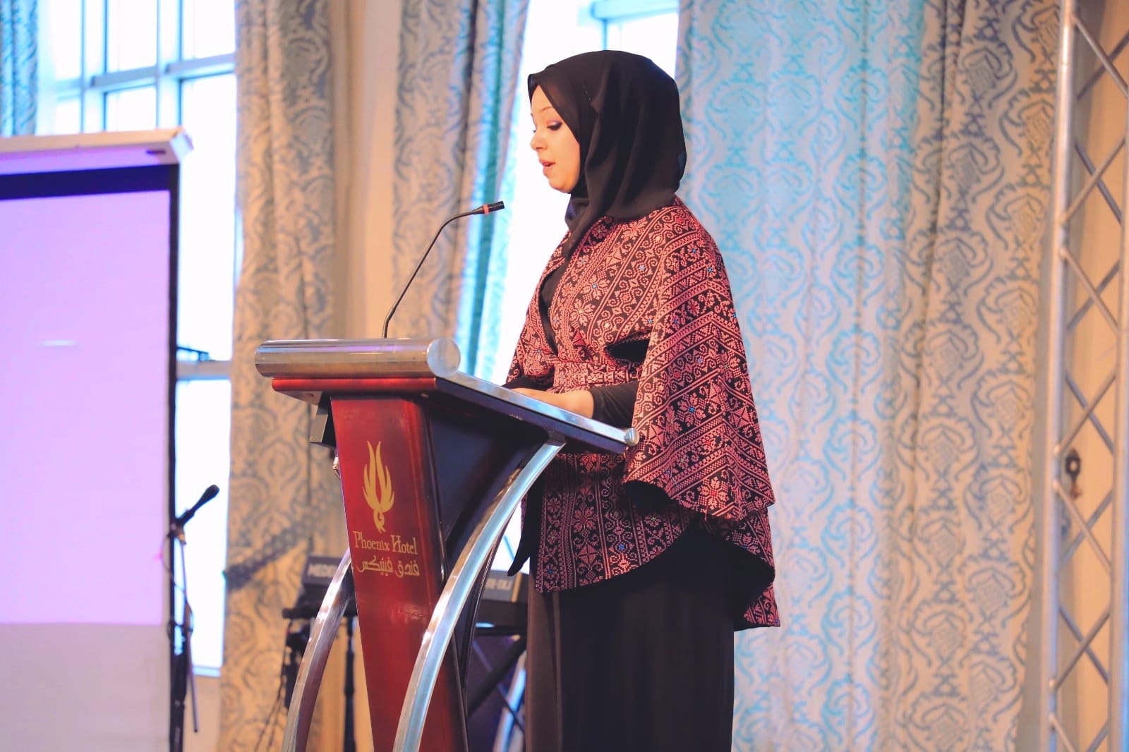 Doaa emcees a special event showcasing children’s art and music in Gaza