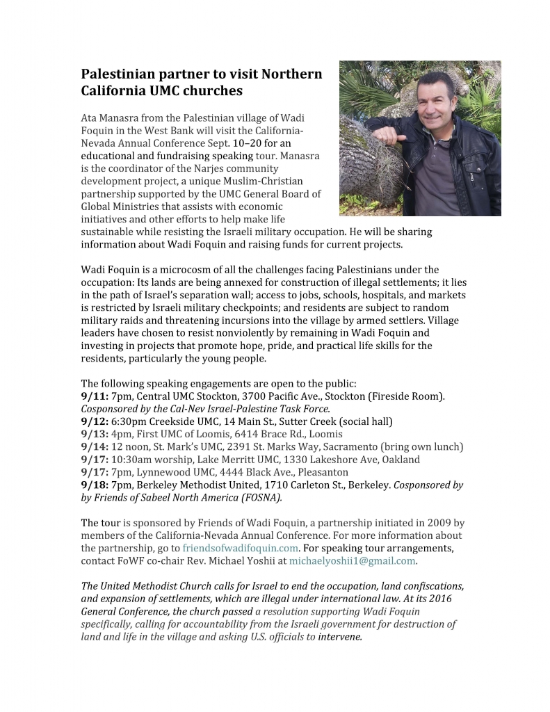 Join Friends of Wadi Foquin for an informative evening with Ata Manasra, mayor of this isolated Palestinian village.